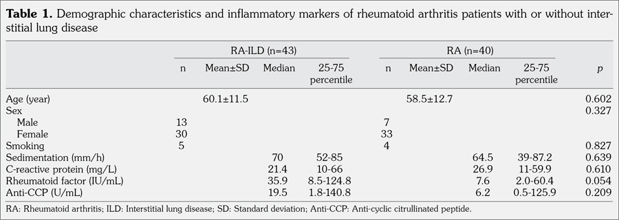 Eighty-three RA patients (20 males, 63 females; mean age 59.3±12.1 years; range 25 to 83 years), 43 with ILD (13 males, 30 females; mean age 60.1±11.5 years; range 25 to 83 years) and 40 without ILD (7 males, 33 females; mean age 58.5±12.7 years; range 28 to 78 years), who were referred to Adnan Menderes University Rheumatology clinic between January 2014 and October 2017 were enrolled in this study. The 2010 American College of Rheumatology/European League Against Rheumatism classification criteria were used for the diagnosis of RA.(12) The diagnosis of ILD was established on the basis of clinical symptoms about the respiratory system, pulmonary function test, chest X-ray, and HRCT. We excluded patients with any connective tissue disease other than RA, tuberculosis or any respiratory infections. The study protocol was approved by the Adnan Menderes University Faculty of Medicine Ethics Committee (approval number 2017/1248). A written informed consent was not obtained from the patients due to the retrospective nature of this study. The study was conducted in accordance with the principles of the Declaration of Helsinki.