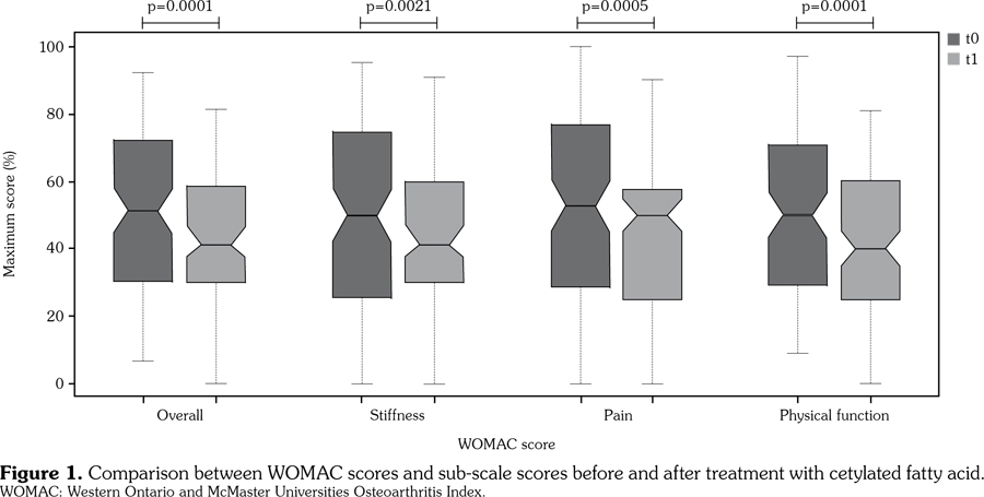 One-hundred and thirteen consecutive knee OA patients (32 males, 81 females; median age 70.0 years; 95% CI: 69.0 to 71.4 years) from four centers were enrolled between January 2014 and December 2016. Diagnosis was established according to American College of Rheumatology (ACR) and European League Against Rheumatism (EULAR) classification criteria.(14) Exclusion criteria were age below 18 years, concomitant knee arthritis, previous knee fractures or major trauma, body weight increase or decrease (±5 kg), and relevant change of activity level during the period of the study. Only one knee was assessed for each patient. Analgesics (such as paracetamol and opioids) were permitted but patients could not exceed the dosages taken before the study beginning. All patients used a CFA-based topical cream mainly made of a blend of CFA (Cetilar®, PharmaNutra, Pisa, Italy). Each patient was instructed to apply a standard quantity of cream on the most painful knee twice per day during a period of one week. The study protocol was approved by the Local Ethics Committees. A written informed consent was obtained from each patient. The study was conducted in accordance with the principles of the Declaration of Helsinki.