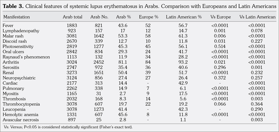 Conclusion: Systemic lupus erythematosus displays several different clinical and serologic characteristics, both among different Arab populations and in comparison to other ethnic groups.