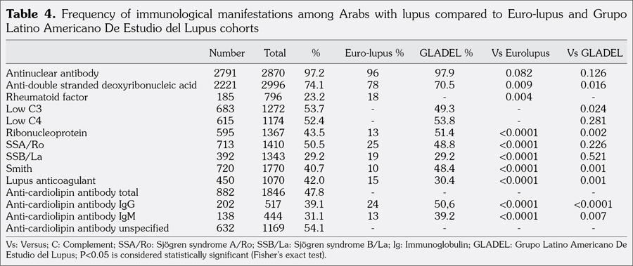 Table 4 compares the frequencies of immunological parameters to Europeans and Latin Americans. There was no significant difference in the frequency of ANA between Arabs and Europeans or Latin Americans. With the exception of anti-dsDNA, all other autoantibodies were significantly more prevalent in Arabs than in Europeans. Anti-dsDNA was lower in Arabs than in Europeans but higher than in Latin Americans. When compared to Latin Americans, there was no difference in the frequency of anti-Ro/SSA or anti- La/SSB. Lupus anticoagulant was higher in Arabs while anti-RNP, anti-Sm and aCL were lower.