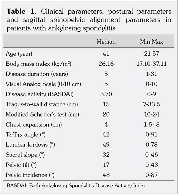 Patients and methods: We enrolled 41 patients (22 males, 19 females; mean age 41.3±8.9 years; range 21 to 57 years) into the study. Sagittal spinopelvic alignment was evaluated measuring thoracic kyphosis, lumbar lordosis, sacral slope, pelvic tilt and pelvic incidence on lateral standing X-rays of the whole spine including the femoral heads. Patients were grouped according to presence of lumbopelvic mismatch (lumbar lordosis- pelvic incidence >10o). Clinical parameters including age, body mass index, pain (Visual Analog Scale), disease activity (Bath Ankylosing Spondylitis Disease Activity Index), and disease duration were recorded. Posture was evaluated measuring tragus-to-wall distance, modified Schober’s test and chest expansion. A computerized pressure plate system (NeuroCom Balance Master®) was used for evaluating static and dynamic balance. Correlations between sagittal spinopelvic alignment parameters and balance were analyzed. Patients with or without lumbopelvic mismatch were compared in terms of balance.