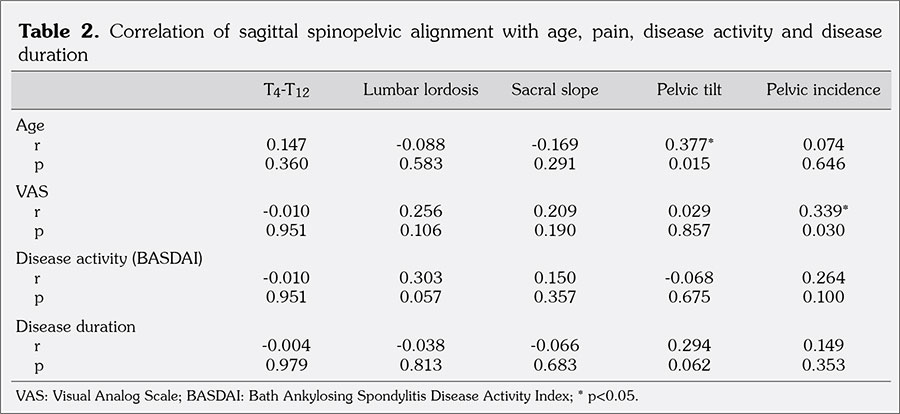 It has been reported that patients with AS had lower pelvic incidence, lumbar lordosis, sacral slope and higher pelvic tilt and sagittal vertical axis when compared to healthy controls.(7,12) Sagittal vertical axis, lumbar lordosis and sacral slope were suggested as predictive factors for the clinical outcomes in AS.(12)