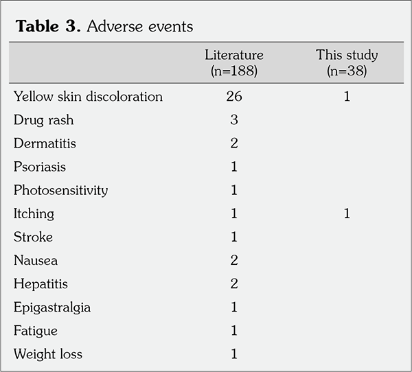 Altogether for lupus and DM, 85.1% of the patients responded to Qn on its own, 68.3% to Qn and HCQ, and 59.4% to Qn and CQ. In four patients, a triple therapy was used (HCQ with Qn and CQ), but only one responded to treatment. The most frequent dose administered was 100 mg. Among the patients who responded, treatment response with Qn alone or in combination was 91.67%, 84%, 83.3%, 68.5%, 100%, and 80% for patients taking 300, 300-100, 200, 100, 150 and 50 mg/day, respectively. Side effects were scarce; one patient had yellow skin discoloration while another experienced itching (Table 3).