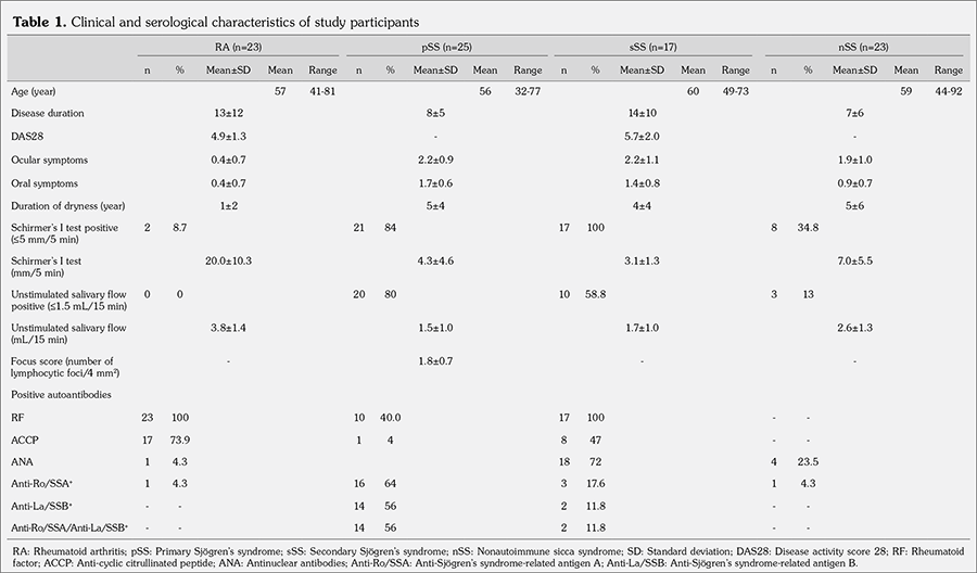 Patients who participated in the study were recruited from the Rheumatology Centre of Vilnius University Hospital Santaros Klinikos between September 2014 and December 2016. Of the patients included, 25 (1 male, 24 females; mean age 56 years; range 32 to 77 years) had primary Sjögren’s syndrome (pSS), 17 (1 male, 16 females; mean age 60 years; range 49 to 73 years) had secondary Sjögren’s syndrome (sSS) due to RA, 23 (5 males, 18 females; mean age 57 years; range 41 to 81 years) had RA and 23 (23 females as control group; mean age 59 years; range 44 to 92 years) had nonautoimmune sicca syndrome (nSS). The diagnoses of pSS and sSS were based on the criteria defined by the American-European Consensus Group criteria for SS.(17) RA was diagnosed according to 2010 American College of Rheumatology (ACR)/European League Against Rheumatism (EULAR) criteria for RA.(18) None of the patients in the control group met the SS classification criteria and they were classified as patients with nSS. All study participants underwent extensive serological evaluation (Table 1). None of the patients was on immunosuppressive medications at the time of the study. A written informed consent was obtained from each subject. The study protocol was approved by the Ethics Committee for Biomedical Research in Vilnius region (2014-05-20, No. 158200-14-733-248). The study was conducted in accordance with the principles of the Declaration of Helsinki.