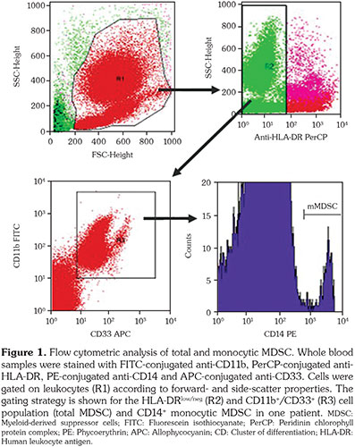 Multicolor flow cytometric analysis was carried out to determine the frequency of MDSC. The following anti-human monoclonal antibodies were used in the study: anti-CD14 (phycoerythrin [PE]), anti-CD11b (fluorescein isothiocyanate [FITC]), anti-CD33 (allophycocyanin [APC]), anti- HLA-DR (peridinin chlorophyll protein complex [PerCP]) (all from BioLegend, San Diego, CA, USA). 50 μL of heparinized venous blood was stained with appropriate amounts of monoclonal antibodies (according to manufacturer’s recommendations) in flow cytometric test tubes. Cell dyeing protocol was carried out as described previously(19) and analyzed using FACSCalibur flow cytometer (BD Biosciences, San Jose, CA, USA) and CELLQuest software (BD Biosciences, San Jose, CA, USA). Flow cytometric gating strategy of total and monocytic MDSCs (mMDSCs) in one patient is presented in Figure 1.