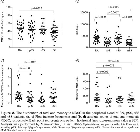 Results: Analysis revealed that the frequency of overall MDSCs increased in RA group (46.5±3.4) compared with nSS group (35.6±3.2; p=0.0322). An increase of absolute count of overall MDSCs was most evident in both RA (4383±456.8) and sSS groups (3890±495.7) compared with pSS (2447±275.1; p=0.0002 and 0.0067) and nSS groups (2025±218.1; p<0.0001 and p=0.0012). The highest absolute count of monocytic MDSCs also manifested in RA group (195.4±39.0), compared with all the other groups (86.0±24.9; p=0.0002 [pSS], 128.5±53.4; p=0.0076 [sSS], 83.7±19.0; p=0.0136 [nSS]).