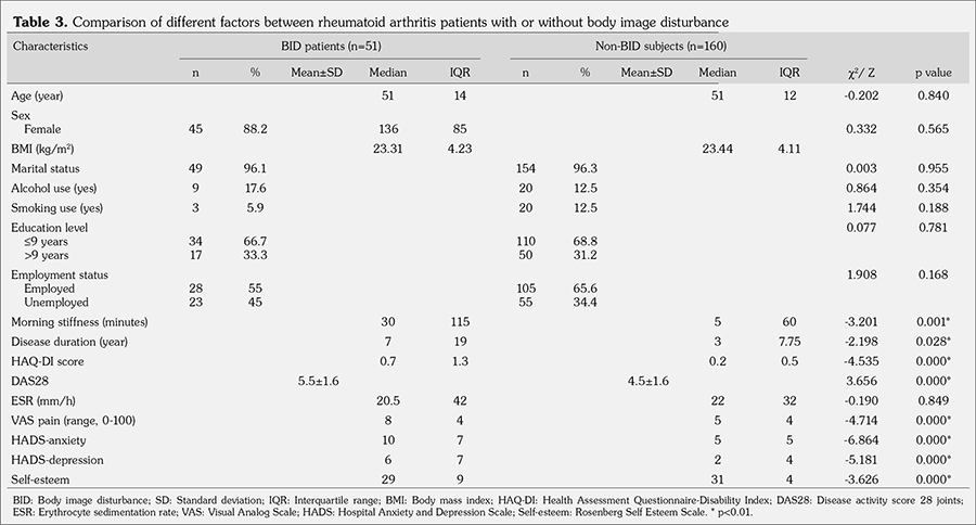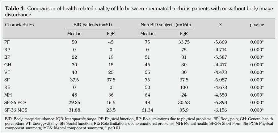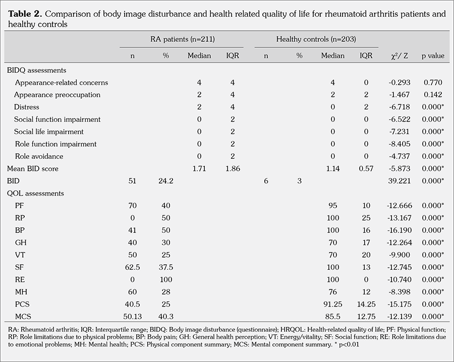 Patients and methods: A total of 211 RA patients (30 males, 181 females; mean age 50.4±12.4 years; range, 20 to 81 years) and 203 age-matched healthy subjects (26 males, 177 females; mean age 49.6±5.6 years; range, 34 to 64 years) were included in this study. Patients were assessed by Body Image Disturbance Questionnaire (BIDQ), Visual Analog Scale, Health Assessment Questionnaire-Disability Index, disease activity score in 28 joints, Short Form 36 health survey, Hospital Anxiety and Depression Scale, Rosenberg Self-Esteem Scale and erythrocyte sedimentation rate.