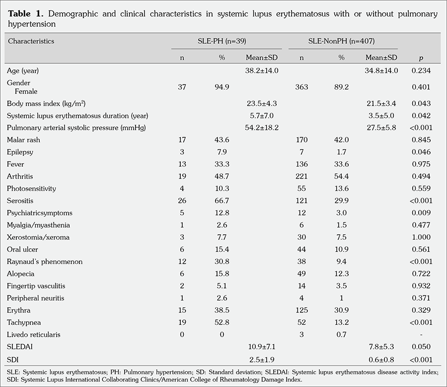 Patients and methods: A total of 39 patients (2 males, 37 females; mean age 38.2±14.9 years; range, 16 to 71 years) with combined SLE and PH and 407 patients (43 males, 364 females; mean age 34.8±14.0 years; range, 7 to 73 years) with SLE but without PH (NonPH) were enrolled and categorized into two groups, namely, PH and NonPH groups. The demographic and clinical characteristics of all patients, including disease duration, comorbidity, malar rash, epilepsy, arthritis, oral ulcer, photosensitivity, Raynaud’s phenomenon, serositis, dyspnea, and visceral damage, were recorded. Laboratory parameters, including blood and urine routine, biochemical markers, 24-hour proteinuria, plasma N-terminal pro-brain natriuretic peptide (NT-proBNP), immunoglobulin, complement 3 and 4, and autoantibodies, were tested. Inflammatory indexes, such as erythrocyte sedimentation rate and C-reactive protein level, were collected. Disease activity was assessed with systemic lupus erythematosus disease activity index score. Organ damage was assessed with the use of Systemic Lupus International Collaborating Clinics/American College of Rheumatology (SLICC/ACR) Damage Index (SLICC/ACR-DI; SDI). Pulmonary arterial systolic pressure was measured using echocardiography.