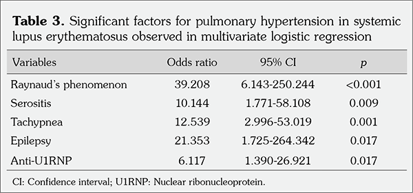 Several researchers presented that disease duration, Raynaud’s phenomenon, pleuritis, positive anti-U1RNP antibody, positive anti-SSA antibody, and positive anti-cardiolipin antibodies are independent predictors of PH in SLE.(15,21) We found that tachypnea, which has been rarely investigated, is an important marker relevant to PH in SLE. Dyspnea is one of the cardinal clinical manifestations of PH. No difference in dyspnea percentage was observed between idiopathic PAH and SLE-APAH.(30) Considering the exclusion of the lung and heart diseases affecting pulmonary artery pressure in our study, tachypnea was considered as an excellent indicator of SLE- associated PH that consumes short time and is assessed and observed easily in the early phase.