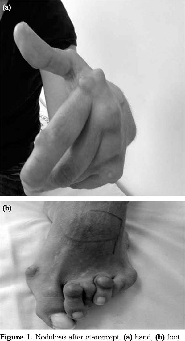 Accelerated nodulosis was first described by Kremer and Lee in 1986 as increased number of nodules in three patients with long-term use of MTX.(6) Since that time, several reports were published indicating that accelerated nodulosis was seen at rates of 8-11% in patients with RA taking MTX.(4) Subcutaneous nodules may develop at a mean of three years after the start of MTX treatment.(7) HLA-DRB1*0401 and RF positivity are related to MTX-induced accelerated nodulosis.(3,8) There have been occasional reports of accelerated nodulosis associated with other disease modifying antirheumatic drugs other than MTX, such as leflunomide, azathioprine and anti- TNF drugs, particularly etanercept.(2,4,5) Newly emerged rheumatoid nodules mainly affect the hands, particularly the metacarpophalangeal and proximal interphalangeal joints. While MTX- induced accelerated nodulosis affects the hands at a rate of 88%, non-accelerated nodulosis affects the hands at a rate of 34%.(3,8,9) Compared to classic rheumatoid nodules, accelerated nodules have more rapid onset and growth, are smaller and follow a different distribution (hand, foot, and ear).(3) Accelerated nodules generally develop while there is low disease activity. Histopathologically, they are not different from rheumatoid nodules. They develop in three zones; internally mononuclear cells surrounding fibrinoid necrosis while externally there is granulomatous inflammation.(6,10) The pathogenesis of drug-related nodulosis is not clear. Increased giant cell formation with A1 receptor stimulation and adenosine production stimulated from the monocytes by MTX could be effective in the pathogenesis and it is theorized that drugs which inhibit adenosine A1 receptor could be useful in MTX-induced accelerated nodulosis.(11) The rheumatoid synovial membrane and rheumatoid nodules are histologically similar. Still, there are some differences. Unlike in the synovium, there are no B cells, plasma cells or organized lymphoid structures in rheumatoid nodules. In addition, E-selectin expression is higher in the blood vessels of rheumatoid nodules than in the synovium. Wikaningrum et al.(12) determined that interleukin-1 beta (IL-1β) was elevated in rheumatoid nodules and not in the synovium. Furthermore, the TNF-alpha (α) level was found to be high in the synovium and low in rheumatoid nodules. Cunnane et al.(2) reported three cases of seropositive arthritis who developed nail bed infarcts and an increased number of nodules two-three months after starting etanercept treatment. It was thought that vasculitis, treatment-related cell death and increased chemotaxis could be responsible in the formation of nodules. Mackley et al.(13) reported a seropositive RA patient who developed nodules on the hands one year after starting infliximab treatment. There is no proven treatment for accelerated rheumatoid nodulosis; therefore, it is wise to stop the offending drug. Various drugs have been attempted for the treatment of accelerated nodulosis,(14) most commonly hydroxychloroquine, colchicine, D-penicillamine, and sulfasalazine.(15-18) Cases of pulmonary nodules were reported that improved with tocilizumab and rituximab.(19,20) Several cases of severe subcutaneous nodulosis treated with rituximab were also reported.(21) In our patient, nodulosis started with the use of MTX first and even increased with further use of etanercept and leflunomide. Contrary to the reports in the literature, after withdrawal from drugs, neither the size nor the number of nodules decreased in our patient. Use of colchicine had a subtle effect and hydroxychloroquine had no effect. The development of nodulosis in our patient during a period of low disease activity was consistent with the literature. The patient being seropositive and having a history of smoking were risk factors for nodulosis, particularly for MTX- induced accelerated nodulosis. HLA-DRB1*0401 positivity was not evaluated in our patient as this evaluation is not available in routine practice at our hospital.
