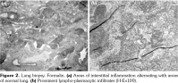 Autoimmunity and the overall state of chronic inflammation are associated with many extra- articular manifestations.(1) Rheumatoid vasculitis is probably the rarest yet the most severe extraarticular manifestation and is usually observed in patients with long-standing, uncontrolled seropositive disease.(2) In this article, we describe the case of a 61-year-old female patient diagnosed with seropositive long-standing rheumatoid arthritis presented to our hospital recently and episodic fluctuations of altered level of consciousness of one week duration, initially diagnosed to have bacterial meningitis based on cerebrospinal fluid analysis with superimposed pneumonia and started on antibiotics with no improvement. Patient is known to have multiple rheumatoid nodules in her chest, followed-up by serial computed tomography scans. Magnetic resonance imaging (MRI) of the brain upon admission showed multiple confluent high fluid- attenuated inversion recovery (FLAIR) signals in the periventricular white matter, hippocampal gyrus and peritrigonal regions of both cerebral hemispheres (Figure 1). In light of the patient’s known diagnosis of rheumatoid arthritis, these findings were compatible with an inflammatory process consistent with rheumatoid vasculitis. Repeated cerebrospinal fluid analysis after antibiotics treatment indicated increased number of inflammatory cells, mainly lymphocytes and monocytes. Open lung biopsy revealed active chronic interstitial pneumonitis (Figure 2). It was then decided to start our patient on steroids: intravenous methylprednisolone 40 mg push twice daily and antibiotics were discontinued with the diagnosis of rheumatoid cerebral vasculitis. She was then discharged on prednisone 40 mg orally once daily.