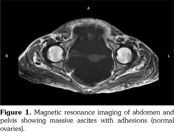 Elevated CA-125 in PPMS may be explained by this type of tumor marker that is highly expressed in mesenchymal cells, produced by cytokines activation as vascular endothelial growth factor or fibroblast growth factor, thereby irritating the mesothelial cells.(2) CA-125 is presumed to be an inflammatory marker.(3) The definite inciting agents that modulate this inflammatory stream might be an operation(4) or drug as leflunomide.(5) However, our case had no obvious risk factor and it is likely that uremic toxins are potentially pro-inflammatory targeting different cytokines (interleukin [IL]-1 beta, IL-18, IL-6, tumor necrosis factor alpha).(6) Thus, we hypothesize that renal impairment and uremia of our patient might have increased the cytokines level exacerbating the inflammatory process and rapid reaccumulation of ascites. In this article, we portrayed a case of lupus nephritis complicated with renal impairment presenting with a benign rare feature of SLE, PPMS.