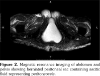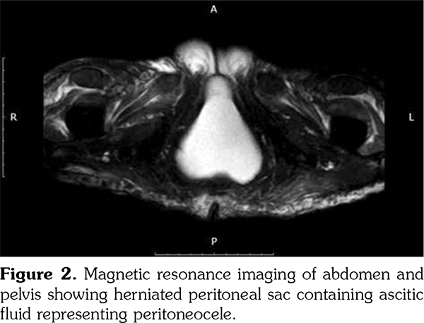 We performed extended investigations that showed normal blood albumin level. Tumor markers were significant only for an elevated serum cancer antigen 125 (CA-125) (80 U/L normal <35). Work-up for TB was negative including adenosine deaminase and polymerase chain reaction in ascitic sampling. Cytology was negative for malignant cells. We conducted computed tomography scan for the chest, abdomen and pelvis with contrast showing massive ascites with ill-defined omental thickening related to the anterior abdominal wall. A cystic lesion was seen at perineal region, minimal bilateral pleural effusion and massive abdominal ascites. Laparotomy and biopsy were performed revealing fat necrosis. Subsequently, magnetic resonance imaging of the abdomen and pelvis was conducted but it was insignificant apart from massive ascites with adhesions. No ovarian masses were observed (Figure 1). In lower perineal region, herniating peritoneal sac was noted containing ascitic fluid representing peritoneocele (Figure 2).