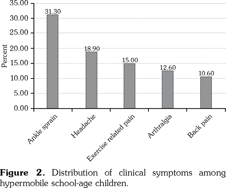 This study has some limitations. We did not assess the musculoskeletal pain or findings undertaken by non-hypermobile children. Therefore, prospective follow-up studies comparing hypermobile and non-hypermobile children are needed to answer the question of whether GJH can increase the risk of future musculoskeletal symptoms. Also, the lack of data in the current study regarding the types of activities children were participating in and injury-related versus non-injury-related sprain limit the clinical significance of the findings. Interestingly, headache was the second most common symptom after ankle sprain. It was caused by servicogenic origin resulting from excessive intersegmental vertebral motion or by the spontaneous intracranial hypotension arising from the leakage from dural membranes fragility or by the involvement of temporalis muscles in temporomandibular dysfunction resulting in tension type headache with pericranial tenderness.(27-29) Likewise, Butt et al.(30) found that headache was the most common non-specific symptom in hypermobile individuals.