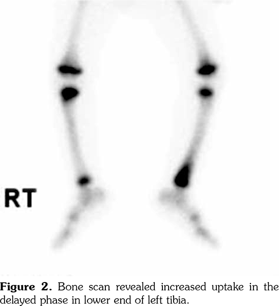 He was started on non-steroidal antiinflammatory drugs (NSAIDs), naproxen, and elemental iron. His fever and joint pain subsided after two weeks. However, two weeks later, he started complaining of pain in the lower end of the left tibia. Three-phase bone scan showed increased tracer uptake in the distal metaphysis of the left tibia in all phases, including flow phase, blood pool, and delayed phase (Figure 2). Plain X-ray of the left leg revealed a well-defined lucency in the distal part of tibial diaphysis with peripheral sclerosis (Figure 3a). Magnetic resonance imaging (MRI) of the left leg revealed a lesion in the left distal tibia diaphysis, which appeared as a central hypointensity with a peripheral rim of signal intensity, with enhancement following administration of intravenous contrast medium (Figure 3b-d). Open bone biopsy of the lower end of the left tibia revealed viable compact bony trabeculae with fibrosis and congestion in the marrow spaces. Features were of periosteal proliferation and were consistent with chronic osteomyelitis (Figure 4). Bone aspirate culture was negative.