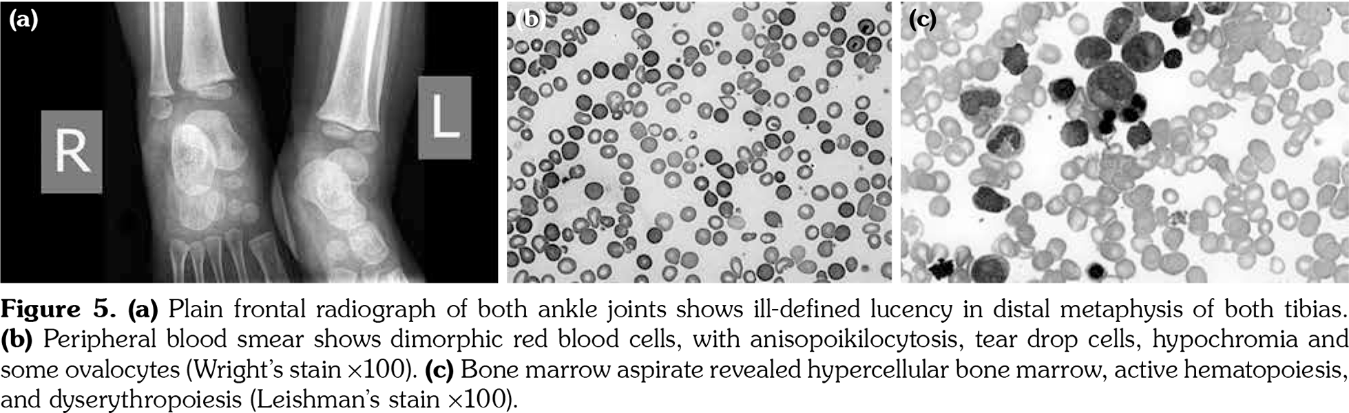 Case 2- Seventeen-month-old female patient who was the sister of case 1 presented with a history of pain in the calves and soles accompanied with intermittent episodes of limping for two months. Her past history was uneventful and her vaccinations were up to date. On physical examination, she was noted to have non-specific tenderness in her ankles and metatarsophalangeal joints that was not associated with any swelling. Plain X-rays of both legs showed ill-defined lucency in distal metaphysis of both tibias (Figure 5a). MRI of the ankle joints was not performed. Laboratory studies revealed a HB level of 7.7 gm/dL and serum iron level of 3 μmol/L. Peripheral blood smear showed dimorphic red blood cells with anisopoikilocytosis (Figure 5b). Tests for the presence of antinuclear antibodies, RF, and ASO titer were all negative. CRP was 54 mg/L. Bone marrow aspiration revealed dyserythropoiesis, suggesting CDA (Figure 5c). The patient was started on naproxen and iron therapy, for which considerable improvement was noted.