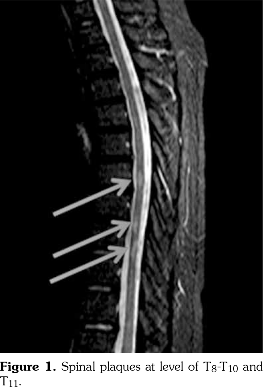 Cranial and spinal magnetic resonance imaging (MRI) showed multiple demyelinating plaques. Thoracal and cranial plaques were not enhancing with contrast agent. Spinal plaques were at the level of T8-T10 and T11 (Figures 1 and 2). Oligoclonal immunoglobulin (Ig) G bands (type II) were detected by immunofixation electrophoresis in cerebrospinal fluid (CSF). Neuromyelitis optica IgG was not found in CSF. Right tibial sensorial evoked potential latency was 64.2 milliseconds and left tibial potential latency was 46.1 milliseconds. He was diagnosed as MS and treated with 1000 mg/daily corticosteroid therapy for seven consecutive days. His hypoesthesia was completely resolved while paraparesis was almost resolved. However, his gait was still ataxic. Interferon (IFN) beta-1a was initiated three times/weekly subcutaneously. On monthly follow-ups, there was no attack for MS. The patient discontinued colchicine treatment by his own will after five months of IFN treatment because he did not suffer from any FMF attacks. He did not suffer even a mild FMF attack from september 2017 until now. He is also under control for MS.