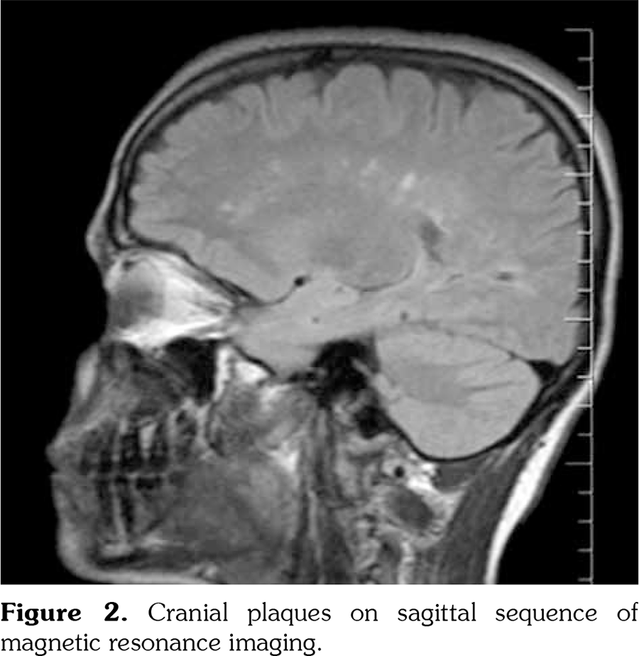 Neurological involvement of FMF is rare, including headaches, aseptic meningitis, electroencephalography abnormalities, and pseudotumor cerebri.[4] Demyelinating diseases rarely coexist with FMF.[5-7] Karabudak et al.[8] evaluated 17 patients with FMF for neurologic complications but could not describe MS-like demyelinating plaques. Akman Demir et al.[3] found 12 FMF patients (9 with MS and 3 with non-MS demyelinating diseases) by evaluating 2,800 MS patients. They suggested a four-fold increased rate of FMF among patients with MS and reported that the presence of MEFV variations could change the incidence and progression of other inflammatory diseases. They also found that the duration between the onset of neurologic disorders and FMF was nearly 20 years.