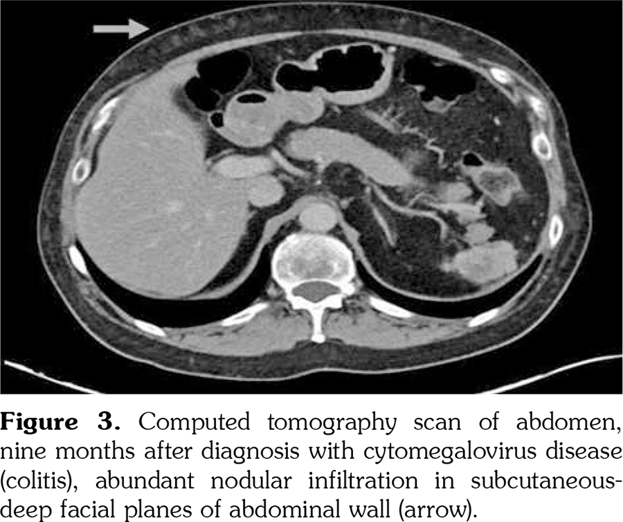 Eight months afterwards, he was hospitalized with a body temperature of 38.3°C and fatigue. On this admission, laboratory examinations revealed high C-reactive protein (4.76 mg/dL) level while no bacterial growth was observed in blood cultures. PCR test detected CMV DNA at 2,400 copies/mL. CT scan of the abdomen showed new abundant nodular infiltration in the subcutaneous-deep facial planes of the abdominal wall (Figure 3). Abdominal subcutaneous fat tissue true-cut biopsy was performed and CMV DNA was detected in the quantitative PCR assay of tissue specimen. He was put on oral valganciclovir treatment while mycophenolate mofetil was permanently discontinued. Following antiviral therapy, azathioprine was started and peripheral blood PCR assay revealed CMV DNA of 57 copies/mL at one month of this treatment.