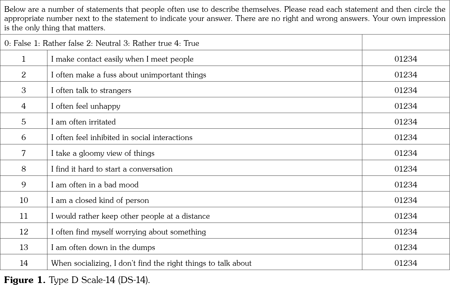 - Denollet J. DS14: standard assessment of negative affectivity, social inhibition, and Type D personality. Psychosom Med 2005;67:89-97.