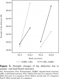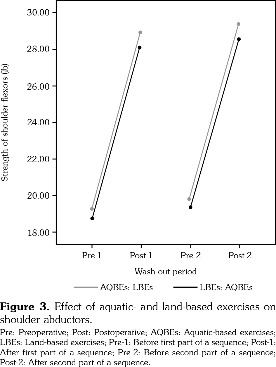 There was a significant improvement of shoulder flexors’ strength (F 3,4=130, p<0.001; Wilks’ Λ=0.025, partial η2=0.975) in both AQBEs and LBEs groups. However, there was no statistical significance (p>0.05) that suggested the superiority of one type of exercise over the other (Figure 2). The strength of shoulder abductors behaved similarly in both types of treatment (F 3,4=52.6, p<0.001; Wilks’ Λ=0.06, partial η2=0.940) with no superiority of one treatment (p>0.05) (Figure 3).