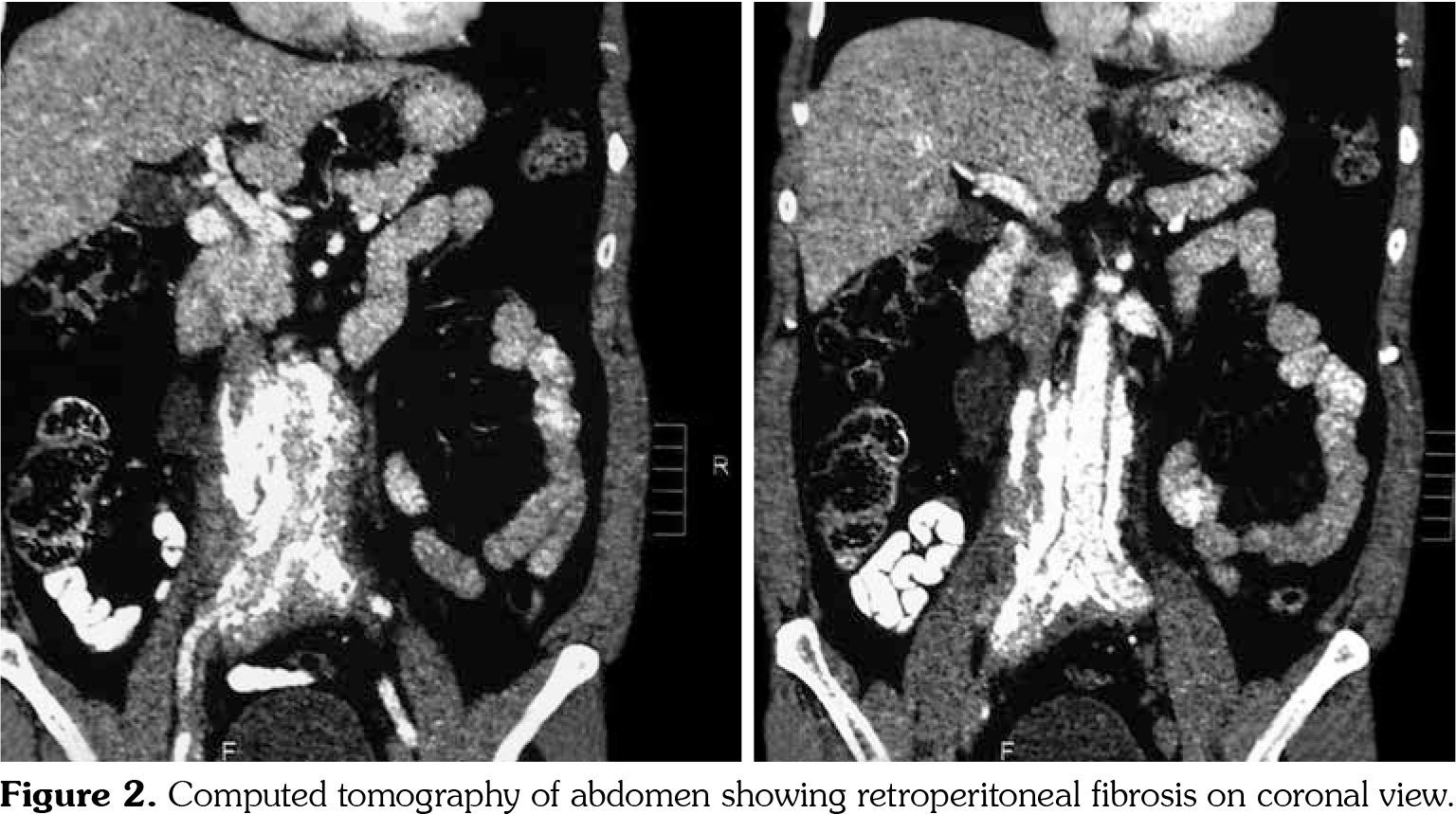 In 1972, Sharp et al.,[1] recorded a group of patients who had clinical features of SLE, SSc and PM with high titers of anti-extractable nuclear antigen antibody. They published it as a new disease entity: MCTD. Since then, there has been an increasing number of classification criteria published for the diagnosis of MCTD, namely, Kasukawa et al.[3] Alarcon-Segovia and Villareal[4] and Kahn and Appelboom.[5] There has been no consensus on clinical features owing to varied manifestations and frequent overlap of symptoms with other autoimmune conditions. However, high titers of antibodies against U1 snRNP have been found in most patients.[6] Our patient had symptoms of dysphagia, epistaxis and ocular sicca coupled with high titers of anti-U1 snRNP which led us to the diagnosis of MCTD. He also had pulmonary involvement in the form of ILD. One study showed 47% of cases of MCTD to have ILD.[7] The most frequent histological picture seen is non-specific interstitial pneumonia, followed by usual interstitial pneumonia and lymphocytic interstitial pneumonia.[8] RPF was first reported by Ormond[9] in 1948. It is a rare condition characterized by inflammation and fibrosis of the retroperitoneum, around the infra-renal portion of abdominal aorta and iliac arteries and usually entraps ureters and inferior vena cava.[10] A recent study reported incidence of RPF around 1.3 per 100,000 population per year in Netherlands.[11] The mean age of presentation is around 50 years with male predominance (2:1-3:1). Abdominal CT and magnetic resonance imaging are the investigations of choice for the diagnosis of RPF and they reveal a homogenous mass near the lower abdominal aorta and iliac arteries that surround and displace the ureters medially. Medical therapies for RPF include steroids, tamoxifen, other immunosuppresives such as azathioprine, mycophenolate and anti-CD20 antibody such as rituximab. In one single-center prospective observational study of 55 patients with RPF treated with tamoxifen monotherapy for a minimum of two years, 47 (85%) patients reported substantial resolution of symptoms after a median treatment duration of three weeks. There was a mass regression in 39 (71%) patients at four months and 47 (85%) patients at eight months of follow-up, respectively. Recurrence- free survival in patients with treatment success after post-treatment follow-up of 21 months was 68%.[12] To our knowledge, there is no previously published case report on presence of RPF in a patient of MCTD. This is indeed a rare occurrence.