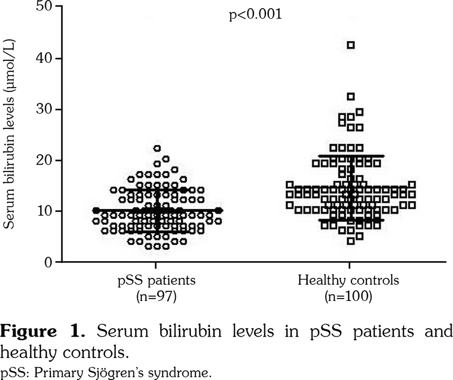 Patients and methods: Retrospective analysis of electronic medical records was performed in 97 pSS patients (12 males, 85 females; mean age 54±15 years; range, 15 to 91 years) and 100 healthy controls (17 males, 83 females; mean age 51±14 years; range, 25 to 75 years). Serum bilirubin and other variables were compared between pSS patients and healthy controls. The European League Against Rheumatism Sjögren's syndrome disease activity index (ESSDAI) was used to assess the disease activity of pSS, and ESSDAI ≥5 was defined as moderate to high activity. The relationship between bilirubin and ESSDAI was analyzed by Spearman's correlation analysis and multivariable logistic regression.
