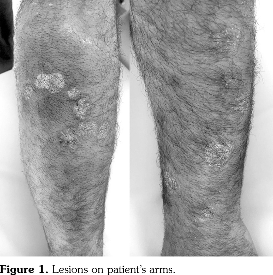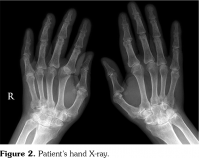 A 45-year-old male patient with RA was referred for newly onset skin rashes on his arms and legs after starting the treatment with tofacitinib (Figure 1). He was taking methotrexate 5 mg/weekly, folic acid 5 mg/weekly and tofacitinib 5 mg twice a day for RA. Disease had started nine years ago, first with pain and swallowing on his ankle. Within one year, arthritis developed on wrist, metacarpophalangeal (MCP) and proximal interphalangeal (PIP) joints, with no involvement in distal interphalangeal (DIP) joints. The patient had no inflammatory back pain symptoms. Psoriasis was not present in his or his family’s medical history. Laboratory tests were negative for antinuclear antibody, extractable nuclear antigen profile, anti-cyclic citrullinated peptide, rheumatoid factor and human leukocyte antigen B27. Erythrocyte sedimentation rate was 26 mm/hour and C-reactive protein was 12.6 mg/L (0-5 mg/L). There were bilateral ulnar styloid erosions, carpal erosions and osteopenia on his hand X-ray; marginal erosions on fifth MCP, second MCP, third PIP joint, subluxation on second MCP joint on right hand; joint erosion and subluxation of first MCP, erosion and joint space narrowing of second PIP joint on left hand (Figure 2). DIP joints were normal on both hands except two osteophytes. On his pelvis anteroposterior X-ray, sacroiliac joint spaces were normal (Figure 3). Patient’s type of joint involvement and radiological findings were consistent with RA but not psoriatic arthritis. In this course, he had used methotrexate, sulfasalazine, leflunomide, hydroxychloroquine and glucocorticoids at different times. Because of the ineffectiveness of the conventional synthetic disease-modifying anti-rheumatic drugs, etanercept was started. Then, etanercept induced skin rashes with unknown characteristics and was stopped subsequently. After improving of the skin rashes, rituximab was started but discontinued due to the ineffectiveness. Tofacitinib was started when his disease activity was high (disease activity score-28 [DAS28] >5.1). Skin rashes appeared on the third month of the tofacitinib therapy while disease activity was low (DAS28=2.8). We consulted the dermatology. Dermatological examination revealed multiple, clearly demarcated, silvery, squamous and erythematous papules and plaques on the arms, legs, and ankles. Skin biopsy was performed. Epidermal parakeratosis, hyperkeratosis, focal hypogranulosis, and acanthosis with elongation of the rete ridges were observed in the skin biopsy. He was diagnosed with psoriasis. We decided that tofacitinib induced psoriasiform lesions, so tofacitinib was discontinued and leflunomide was started. After two months, lesions were improved. A written informed consent was obtained from the patient.