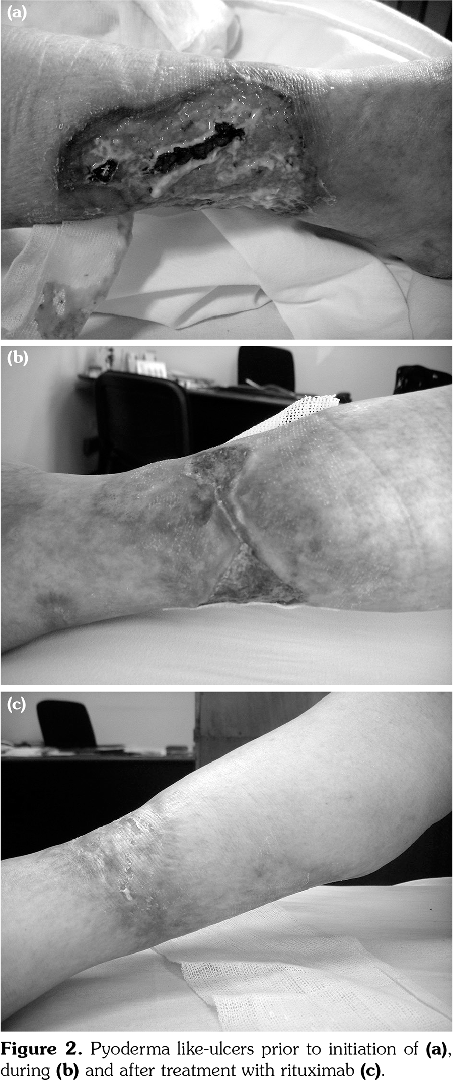 In February 2009, due to extended skin lesions and necrosis, and considering two possible pathogenic mechanisms; vasculitis and thrombosis secondary to APLs, intravenous RTX 375 mg/m2 (750 mg) was initiated once a week for four weeks with successful response (Figures 2a-c). Two months after the last infusion, improvements in the skin lesions were seen.