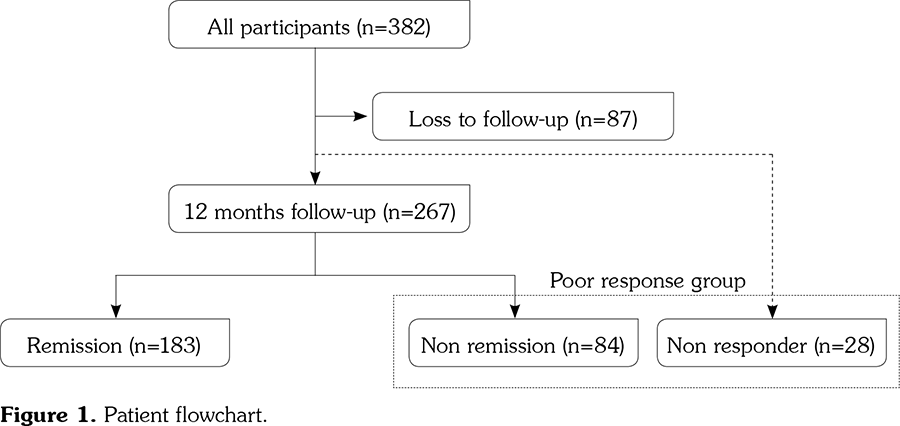 From the records, we obtained a serological test to examine immunoglobulin M rheumatoid factor (RF) and anti-cyclic citrullinated peptide (anti-CCP) antibody. We categorized patients with RF >20 IU/mL and anti-CCP antibody >5 U/mL as seropositive. Additionally, we individually assessed Steinbrocker’s stages on X-ray and Steinbrocker’s functional classes at the baseline.[18] Clinical information, including current and previous medication for RA, tender and swollen joint counts in 28 joints, patient’s and physician’s global visual analog scale (VAS), erythrocyte sedimentation rate (ESR), serum levels of C-reactive protein (CRP), and the Health Assessment Questionnaire (HAQ) Disability Index were collected at every visit from the start of anti-TNF-α drug. A Simplified Disease Activity Index (SDAI) was used to assess the outcome, and we defined non-remission as an SDAI ≥3.3 after 12 months.[19] The SDAI is the numerical sum of five outcome parameters: tender and swollen joint counts in 28 joints, patient’s and physician’s global VAS, and CRP level. In addition, we considered those who had to terminate the anti-TNF-α therapy because of non-response as non-responders. Non-responders were allocated <12 months at the discretion of the rheumatologist based on the idea that the patients will inevitably experience non-remission at the 12-month follow-up, that is, they were rated as no response by the EULAR response criteria after about six months.[20] Namely, the total number of poor responses to the anti-TNF-α therapy was the sum of non- remission after the 12-month follow-up and non- responders. We excluded the patients who were lost to follow-up within 12 months for reasons other than non-responder.