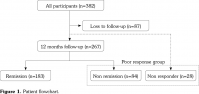All 382 patients were monitored regularly (Figure 1). We restricted the participants according to the standard of care, including non-responders switching from adalimumab. Consequently, 87 patients who were lost to follow-up for reasons other than of non-response (n=43) and those who had been followed for <12 months (n=44) were excluded. Among the remaining 295 patients, 28 (1%) were censored as non-responders. At the 12-month follow-up, 183 patients (62.0%) of the 295 had reached SDAI remission. Table 1 shows the baseline characteristics of the 382 patients according to their follow-up status. A BMI ≥27.5 kg/m2 (obesity) was recorded in 16 (4.2%) of 382. Table 2 shows the baseline characteristics of the patients according to BMI categories. Obese patients were more likely to have never smoked (never smoker, 62.5%), seronegative (anti-CCP antibody positive 57.5% and RF positive 40.2%), and have shorter disease duration (interquartile range, 12 months). Regarding disease activity, the obese patients’ composite measure and component parameters tended to be slightly higher.