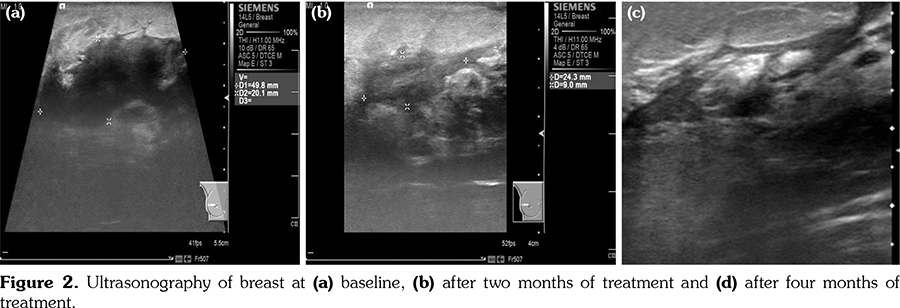 A 24-year-old female patient with no known comorbidities developed sudden onset pain and redness in right breast. She was diagnosed with right-sided mastitis by primary care physician and treated with oral antibiotics and analgesics for a week. She had symptomatic improvement with treatment. Two months later, she again developed pain in right breast accompanied with ill defined erythematous swelling over right periareolar area and pus discharge from swelling and nipple. Ultrasonography of the breast showed loculated breast abscess of 5•3 cm. Fine needle aspiration cytology of the lesion showed sheets of pus cells without any evidence of dysplasia. She underwent incision and drainage of breast abscess and thick pus was drained. Pus cultures were sterile and gram stain and acid-fast bacilli (AFB) stain were normal. She was treated with antibiotics for two weeks. Her symptoms improved for a while but two weeks later she again developed swelling over right breast with pus and blood discharge from right nipple. She was brought to our hospital. On examination, she had right periareolar induration. Ultrasound of both breasts detected ill defined hypoechoic area measuring 50•20 mm in right breast with hyperreflective surrounding parenchyma suggestive of surrounding inflammation (Figure 1). Her routine laboratory investigations were normal except mild leucocytosis and high erythrocyte sedimentation rate (ESR) (white blood cells: 11,400/cumm, ESR: 55 mm/hour). Pus culture did not reveal growth of any micro-organism. True cut biopsy was performed which showed focal architectural distortion of breast tissue by dense inflammatory infiltrate of lymphocytes, plasma cells, histiocytes and foamy macrophages. There was dense sclerotic stroma and periductal inflammatory infiltrate (Figure 1). No granulomas were seen. AFB stain and special stains for fungus were negative. On immunohistochemistry, IgG positive plasma cells were seen and 45% plasma cells showed IgG4 positivity. Her serum IgG4 levels were elevated (142 mg/dL). A diagnosis of IgG4-RM was established based on Japanese consensus criteria and the patient was started on glucocorticoids therapy (1 mg/kg). She had improved pain and discharge in follow-up visit after two weeks. Methotrexate (15 mg/week) was added as steroid sparing agent. Her follow-up ultrasound of breast after two months revealed significant reduction in size of abscess (50•20 mm -> 24•9 mm) (Figure 2). After three months of treatment, the abscess resolved completely. Her oral steroids were gradually tapered and she was continued on methotrexate therapy. At present, patient is symptom free at 12 months of regular follow-up and her IgG4 level is 85 mg/dL. A written informed consent was obtained from the patient.
