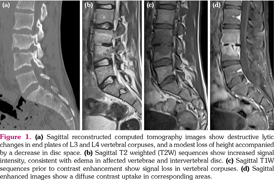 Physical examination identified tenderness in the lumbar vertebrae upon palpation. Laboratory tests showed C-reactive protein of 8.7 mg/dL, erythrocyte sedimentation rate of 43 mm/h and procalcitonin level of 47.28 ng/mL. Peripheral blood smear and bone marrow examination revealed normal findings. Tuberculin skin test of 1 mm, quantiferon test and sputum stain for mycobacteria were negative, Rose Bengal and brucella tube agglutination were negative, brucella IgM was 0.40 (negative) and IgG was 0.75 (negative), no growth was detected in brucella culture and tuberculosis and brucella tests were negative. The autoantibodies including antinuclear antibodies, anti-double stranded deoxyribonucleic acid, ANCA and human leukocyte antigen B27 were negative.