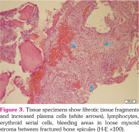 Bone biopsy was performed due to increased signal intensity and the observation of lytic and destructive lesions on lumbovertebral MRI scans. Fibrotic tissue fragments were observed among the bone spicules in tissue samples. The increased number of plasma cells in these tissue fragments was remarkable (Figure 3). Immunostaining for IgG and IgG4 showed diffuse staining for IgG, and IgG4 11/high- power field (HPF) was observed (Figure 4). Serum IgG and serum IgG4 levels were found to be elevated according to Oxford immunology data (IgG4: 336 mg/dL [10-135 mg/dL], IgG: 1656 mg/dL [600-1600 mg/dL]).