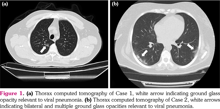 Case 1- A 47-year-old male patient with AS applied to the emergency service with the symptoms of fever, shortness of breath and non- productive cough. He had been on etanercept treatment for three years. He had no other known comorbidities. Even though the polymerase chain reaction (PCR) test for SARS-CoV-2 was found negative, he was diagnosed as COVID-19 due to thorax computed tomography (CT) signs relevant to viral pneumonia (Figure 1a). Hydroxychloroquine and azithromycin were started. Patient’s baseline high C-reactive protein (65.5 mg/L) was the only laboratory test related with poor prognosis. Thereafter, he was discharged with full recovery at the fifth day of hospitalization.