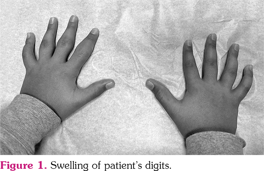 A previously healthy 12-year-old male patient presented with one-year history of bilateral (left more than right) swelling of the proximal interphalangeal (PIP) joints (Figure 1). The patient denied any tenderness with movement, nocturnal pain, or morning stiffness. The only findings on physical examination were swelling of the PIPs of the fingers. Laboratory investigations including complete blood count with differentials, erythrocyte sedimentation rate, rheumatoid factor, and antinuclear antibodies were normal. Hand radiographs revealed nonspecific swelling of the volar soft tissues abutting the distal metaphysis of the proximal phalanges of the second to fifth fingers (Figure 2). The patient was diagnosed with Thiemann’s disease (Online Mendelian Inheritance in Man: 165700).