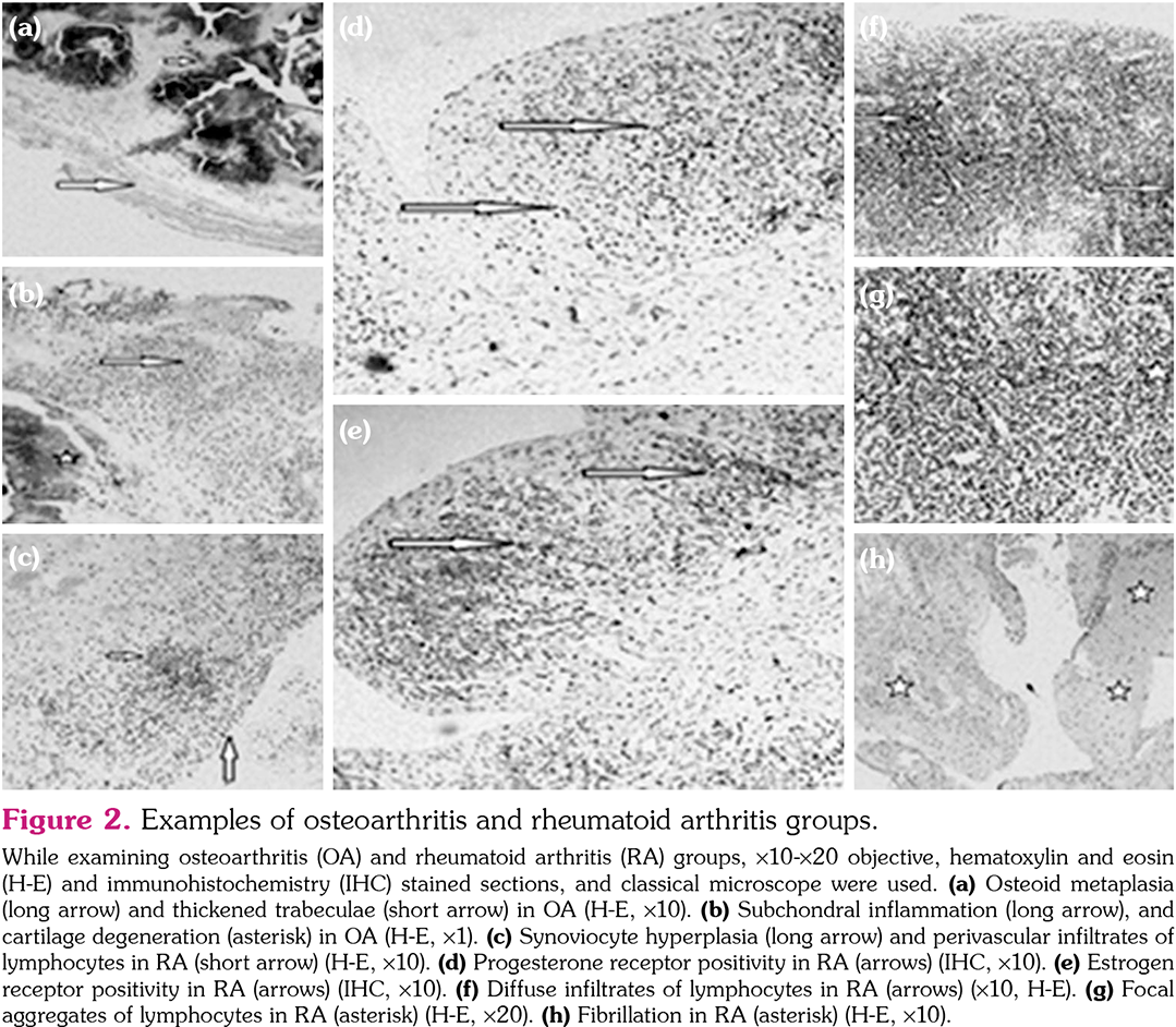 Biopsy samples were examined with �10-�20 objectives using a conventional microscope (Nikon Eclipse E600, Nikon AG, Egg, Zurich, Switzerland). The evaluation was performed by an experienced pathologist who was unaware of the clinical diagnosis. Rooney score was used to evaluate histopathological features in RA.[6] This score consists of the following six items: synoviocyte hyperplasia, fibrosis, proliferating blood vessels, focal aggregates of lymphocytes, perivascular infiltrates of lymphocytes, and diffuse infiltrates of lymphocytes.[6] The following parameters were used for histopathological features in OA:[7] chondroid-osteoid metaplasia, fibrillation, cartilage degeneration, thickened trabeculae, and subchondral inflammation. RA parameters were scored according to Rooney. In this scoring, the parameters are scored between 0 and 10. A high score indicates that the level of synovial inflammation is high. Histopathological findings and receptor status of OA were recorded as negative-positive. The relationship between the presence of hormone receptors and histopathological findings was investigated (Figure 2).