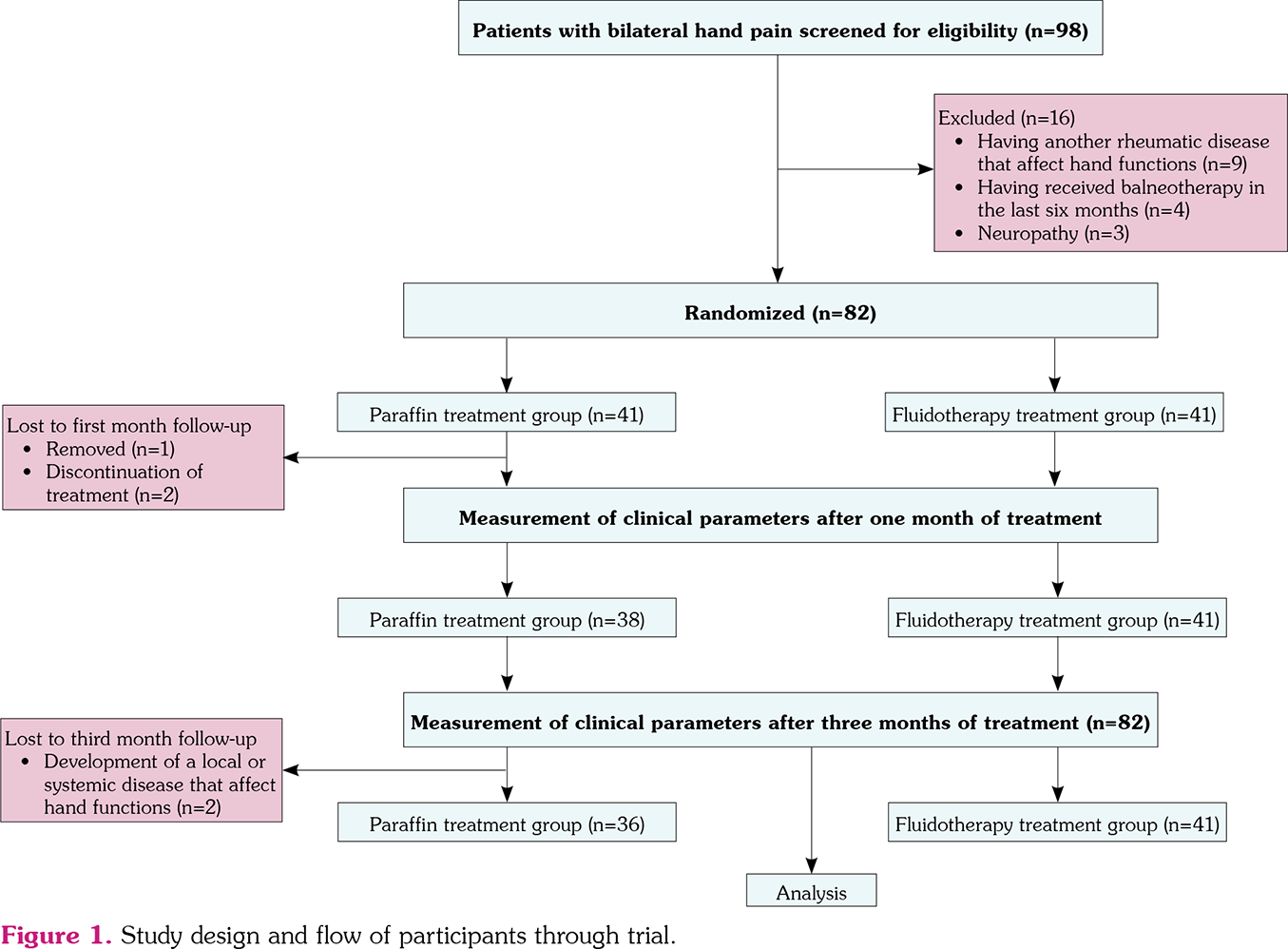 A total of 16 patients were excluded from the study based on the exclusion criteria (nine patients had another rheumatic disease that affected hand functions, four had received balneotherapy in the last six months, and three were diagnosed with neuropathy). Remaining 82 patients were randomly assigned into fluidotherapy or paraffin groups via the sealed envelope method. However, in paraffin group, at the first month control, one patient left the study due to moving out of the city, two patients discontinued the treatment without giving any reason, and at the third month follow-up, two patients developed a local or systemic disease affecting hand function. Finally, a total of 77 patients (8 males, 69 females; mean age: 63.1±10.3 years; range 39 to 88 years) (36 in paraffin group, 41 in fluidotherapy group) completed the study (Figure 1). The study protocol was approved by the Necmettin Erbakan University, Meram Faculty of Medicine Ethics Committee. A written informed consent was obtained from each patient. The study was conducted in accordance with the principles of the Declaration of Helsinki.