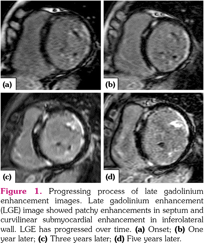 A 42-year-old female patient admitted to our hospital with muscular weakness and palpitations. Skeletal muscle biopsy reveled infiltration of lymphocytes surrounding muscle fibers consistent with the diagnosis of polymyositis (PM). Conventional cardiac angiography showed absence of macrovascular stenosis. The histopathological finding of myocardial biopsy was consistent with acute myocarditis. We performed cardiac magnetic resonance imaging (CMRI) to evaluate myocardial damage. Images were assessed for late gadolinium enhancement (LGE), T2-weighted imaging (T2WI) and extracellular volume (ECV) fraction. LGE images showed patchy enhancement in the septum and curvilinear myocardial enhancement in the inferolateral wall (Figure 1a). CMRI one year later revealed not significantly changed LGE (Figure 1b), expansion three years later (Figure 1c) and more expansion five years later (Figure 1d) without creatinine kinase elevation and cardiac symptoms. After five years, no significant abnormalities were seen in T2WI (Figure 2a). ECV fraction increased in the myocardial layer of anterolateral wall, the middle layer of septum and the papillary muscle, consistent with the region of LGE (Figure 2b, c). ECV can detect diffuse myocardial edema in areas that do not exhibit abnormalities on T2WI. Presumably, this is active inflammatory cell infiltration. Myocarditis in PM with such a unique LGE pattern is rare. There are a few reports of ECV increasing heterogeneously in PM. Cardiac involvement in PM is a frequent complication and often life-threatening.[1,2] Despite alleviating inflammation and dissipation of symptoms, asymptomatic myocardial damage progressed gradually in this case. CMRI including ECV can be a useful method of evaluating myocardial damage.