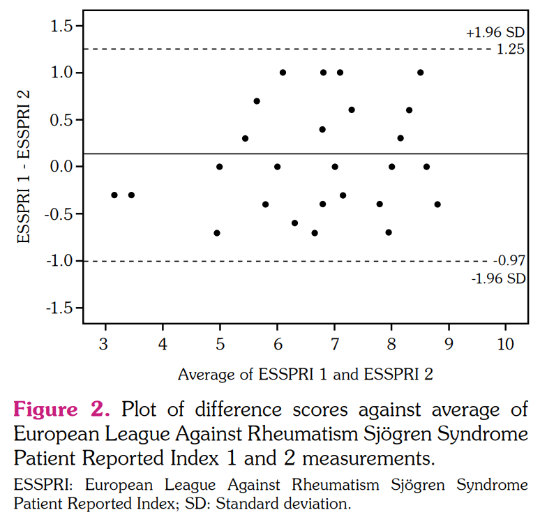 The test-retest reliability of ESSPRI (TR) was found to be quite high. The obtained intraclass correlation coefficients and confidence intervals were given in Table 5. When the difference between the test and retest was examined with the Bland-Altman plot, there was no value exceeding the confidence limit for the difference and the differences were distributed randomly around zero (p=0.186; Figure 2).