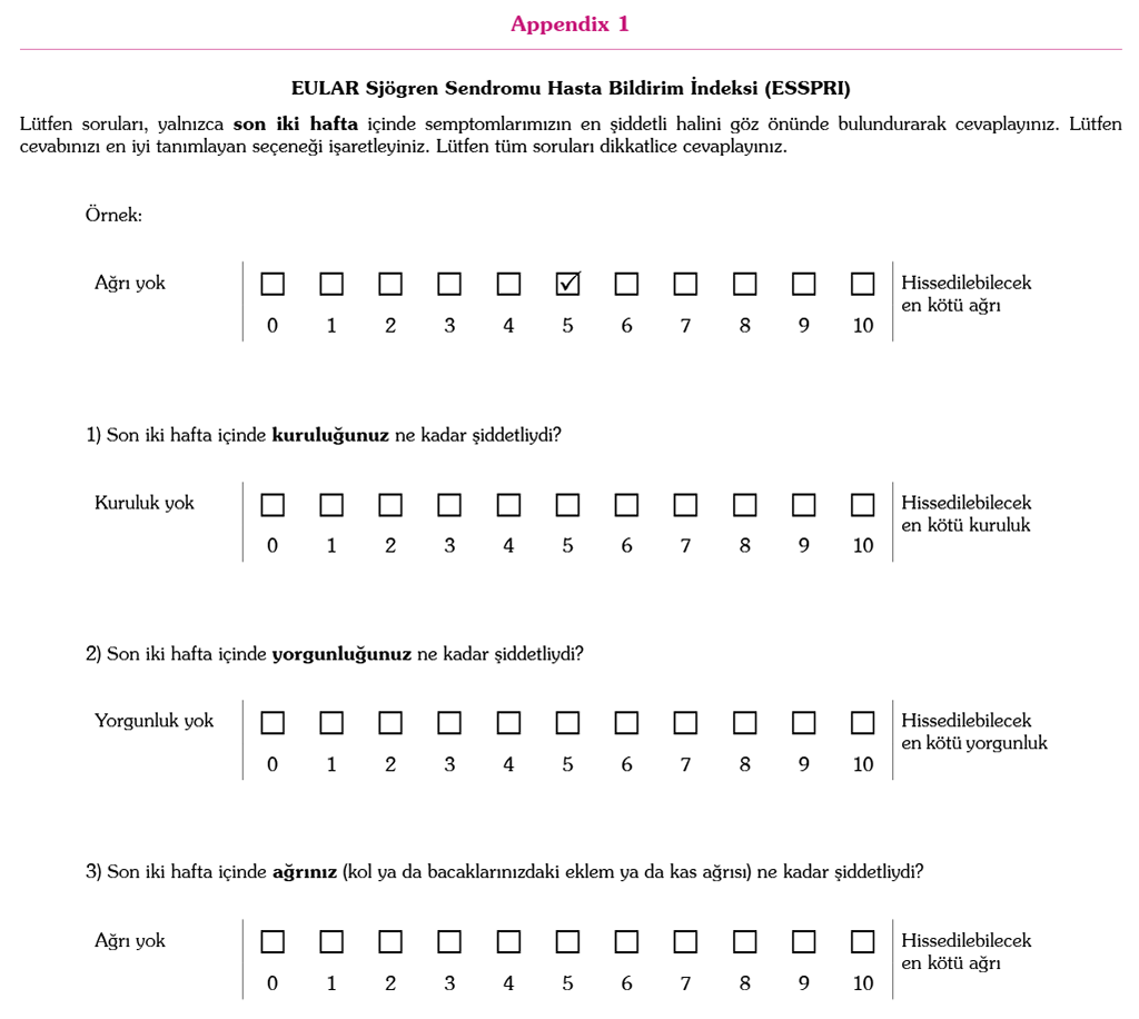 The ESSPRI is a symptom severity assessment questionnaire completed by the patient and used to evaluate SS. The patient is asked to express complaints of fatigue, pain and dryness with a score of 0-10. While a score of 0 indicates no symptoms, a score of 10 indicates the highest level of symptoms. When scoring, the patient is asked to mark the scoring that best describes his or her condition in the last two weeks. The patient should indicate the option that best describes the severity of his or her symptoms over the past two weeks. Each area independently indicates the severity of the symptom. The final score is obtained by averaging the scores of the three domains. While an ESSPRI score of <5 is considered as acceptable disease status, a score of ≥5 indicates high disease activity findings.[18]
