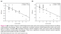 We compared the values of MDI and UMI among the Larsen grades. Mean values of MDI and UMI were both significantly related to increased Larsen grades pre-bDMARD therapy (Table 2). There was a strong correlation between MDI and Larsen grade at baseline (correlation coefficient: r=0.813, p<0.001) (Figure 2a). Similarly, there was a moderate correlation between UMI and Larsen grade (correlation coefficient: r=0.549, p=0.0005) (Figure 2b). Therefore, both MDI and UMI might be useful markers of radiographic damage similar to the Larsen grading system.