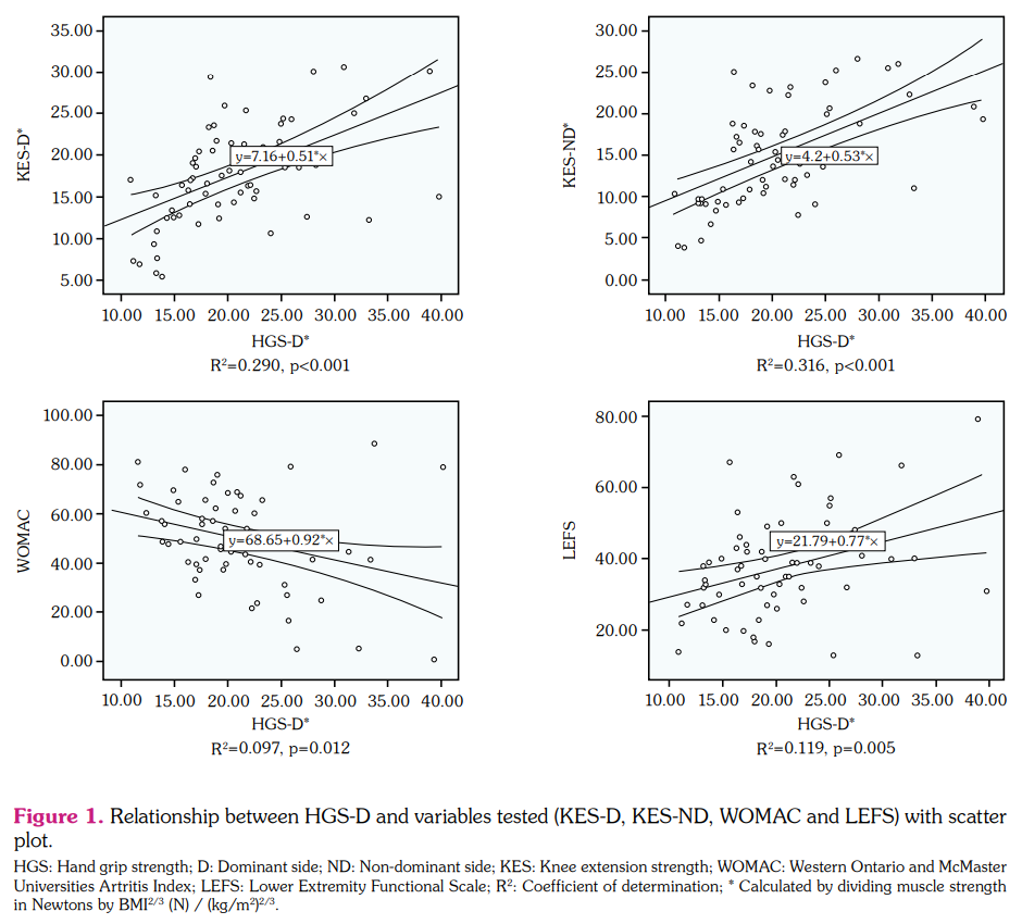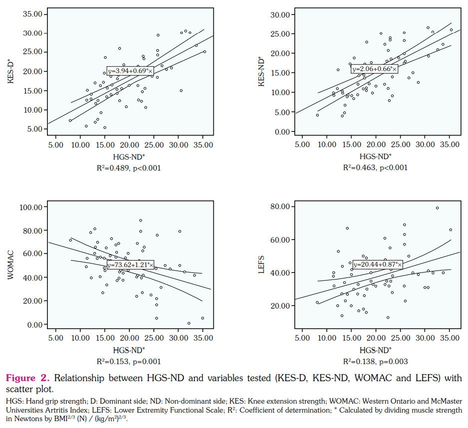 Conclusion: Our study results show that HGS-ND is associated with KOA radiologically and functionally. The HGS should be added in the WOMAC and LEFS scales in the functional assessment of KOA and new scales including HGS assessment should be developed.