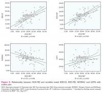 In addition to the correlation analysis, a linear regression analysis was performed to examine a possible relationship between HGS-D, HGS-ND and KES-D, KES-ND, WOMAC, and LEFS (Table 4). The scatter plot of HGS-D, HGS-ND on KES-D, KES-ND, WOMAC and LEFS with regression line and %95 confidence interval (CI) are also shown in Figures 1 and 2. There was a statistically significant relationship between the HGS-D and KES-D (R2=0.290, p<0.001), KES-ND (R2=0.316, p<0.001), WOMAC (R2=0.097, p=0.012), LEFS (R2=0.119, p=0.005). Also there was a statistically significant relationship between the HGS-ND and KES-D (R2=0.489, p<0.001), KES-ND (R2=0.463, p<0.001), WOMAC (R2=0.153, p=0.001), LEFS (R2=0.138, p=0.003).