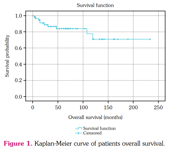 In terms of the survival rate, de Joode et al.[13] found that the survival rate at 12 and 60 months was 98% and 93%, respectively. Our five-year survival rate was also high, similar to that reported in other studies (83.8% vs. 74 to 93%, respectively).[2,14] In addition, the median survival time in this study was 58 months, similar to a previous study (58 months).[11]