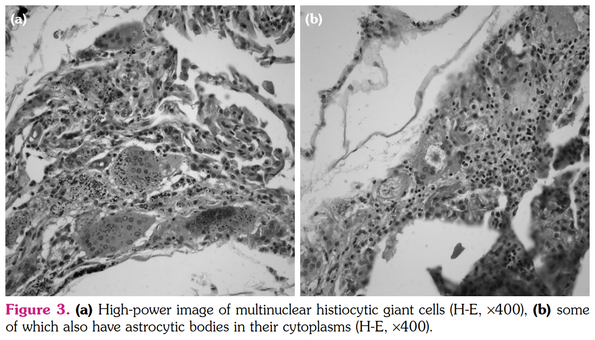 The smears of bronchoalveolar lavage (BAL) were negative for any bacteria, fungi, or acid- fast bacilli. Cytological examination revealed numerous macrophages, few lymphocytes, and few neutrophils. BAL cultures were also negative. Serological tests for the infection of viruses and fungi were negative. The pathological examination of pulmonary wedge resection performed from lingula revealed foreign-body type giant cell reaction and poorly- formed non-caseating granulomas distributed mainly along interlobular septa and subpleural zones (Figure 2). Asteroid bodies as well as a birefringent material were seen in the cytoplasms of giant-cell histiocytes under polarized microscope (Figure 3a, b). Histochemical stains did not reveal any microorganisms and lung tissue cultures were also negative for any mycobacteria species. Based on the clinical, radiological, and pathological findings, a diagnosis of sarcoid-like granulomatous reaction induced by adalimumab was confirmed. Given the lack of radiological response four months after cessation of adalimumab, methylprednisolone 32 mg/day peroral was initiated. The patient was controlled every month initially and every two months thereafter with a gradual reduction in methylprednisolone dosage. At the end of nine months of steroid therapy, a control CT of thorax revealed stable nodular opacities in both lungs. As psoriatic lesions gradually increased and worsened during this period, ustekinumab was started.
