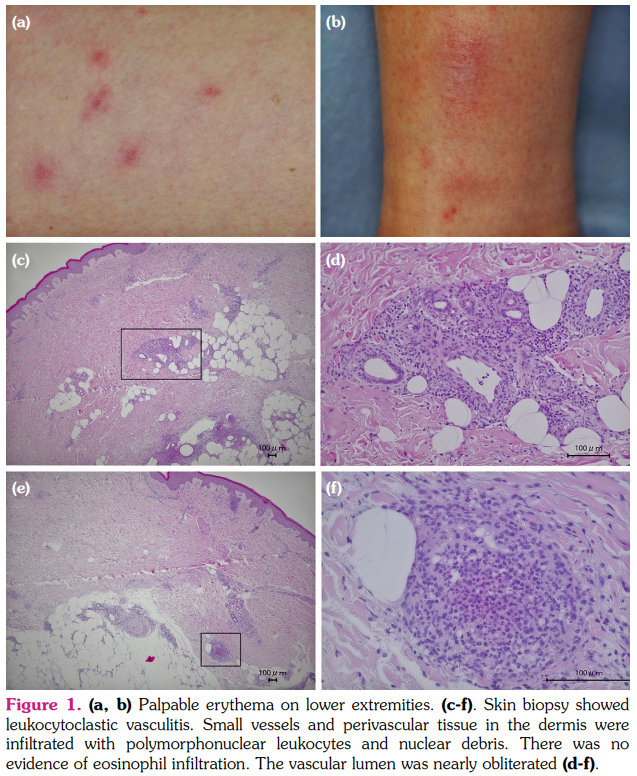 A 56-year-old Japanese woman with limited cutaneous systemic sclerosis developed a dry cough three years after the diagnosis and was referred to our hospital for further assessment. Skin thickening of her fingers and forearms was observed, but neither erythema nor purpura was present. Serum C-reactive protein (CRP) was 0.1 mg/dL, and anti-nuclear antibody was positive (1:1,280 with nucleolar and discrete speckled pattern); anti-centromere, anti-Scl-70, anti-RNA polymerase III, and myeloperoxidase- and proteinase 3-antineutrophil cytoplasmic antibodies were negative. Computed tomography revealed a mild interstitial pneumonia. She received oral cyclophosphamide 50 mg per day for the treatment of skin and pulmonary involvement, as she refused intravenous cyclophosphamide therapy. Since oral cyclophosphamide for one year had no effect on the pulmonary involvement, it was discontinued, and the patient was switched to daily oral AZA 50 mg the next day. Ten days after the administration of AZA, she developed palpable and painful erythema on both extremities (Figure 1a, b). Serum CRP level was elevated to 13.8 mg/dL, while complete blood count, serum transaminase, and creatinine levels remained unchanged. Skin biopsy was performed, and AZA was discontinued. The biopsy revealed leukocytoclastic vasculitis in the dermis, consistent with CSVV (Figure 1c-f). One week after cessation of AZA, her erythema almost completely resolved, and serum CRP level decreased to 0.83 mg/dL. Due to the immediate improvement after cessation of AZA, she was diagnosed with CSVV associated with AZA, and oral cyclosporine was administrated. She had no recurrence of erythema and developed no signs of systemic vasculitis for five years. Subsequent genotyping of nucleoside diphosphate-linked moiety X-type motif 15 (NUDT15) codon 139 showed an Arg/Arg genotype.