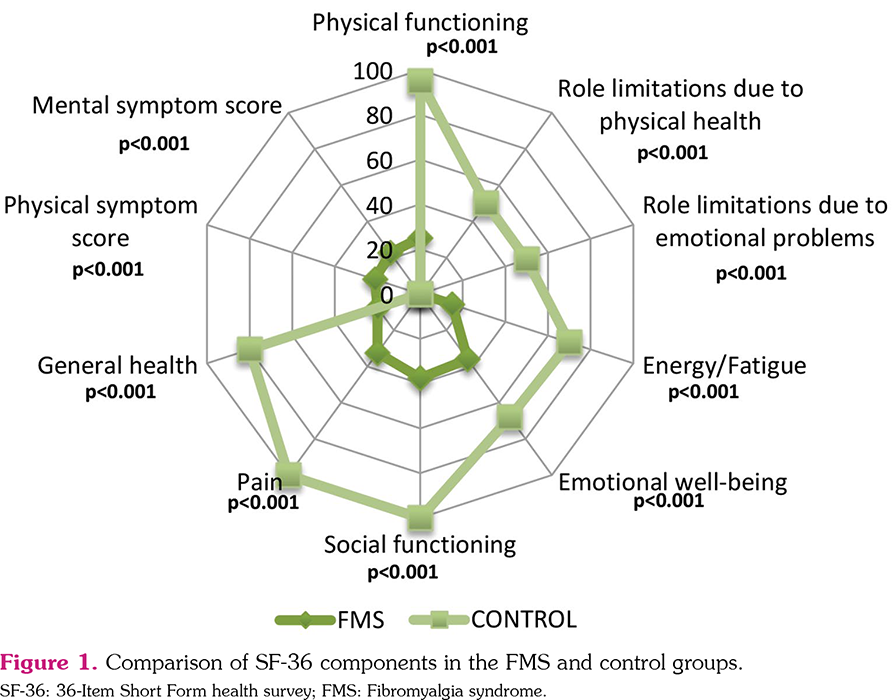 This cross-sectional, case-control study was conducted at Mersin University Faculty of Medicine, Department of Physical Medicine and Rehabilitation between 2015 and April 2016. Thirty-five consecutive female patients with FMS (mean age: 42.0±11.8 years; range, 21 to 62 years) who directly applied or were referred to our outpatient clinic and fulfilled the 1990 American College of Rheumatology (ACR) for FMS were included. The control group consisted of sex- and age-matched 35 healthy controls (mean age: 43.7±8.8 years; range, 21 to 56 years) recruited from the general public and hospital staff. Patients were excluded from the study, if they had any inflammatory, metabolic, and neuromuscular disorder, severe infectious disease, malignancies, hepatic and renal disease or severe psychiatric disorder, serious comorbidities and cognitive impairment. None of the participants were immigrants, and individuals who were under the age of 18 and more than 65 years-old, pregnant, breastfeeding, and illiterate or did not have a sufficient mastery of Turkish language were also excluded. Due to the extremely limited numbers, data obtained from male patients were dismissed, as it would not be statistically conceivable to include them in the analysis, particularly while making sex comparisons. A written informed consent was obtained from each participant. The study protocol was approved by the Mersin University Faculty of Medicine Clinical Research Ethics Committee (No: 2015/216). The study was conducted in accordance with the principles of the Declaration of Helsinki.