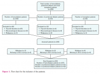 This cross-sectional study was conducted at Hitit University Faculty of Medicine, Departments of Physical Medicine and Rehabilitation and Nephrology between January 2018 and January 2019. A total of 107 hemodialysis patients (Group 1) (48 males, 59 females; median age: 50 years; range, 42 to 56 years), 51 peritoneal dialysis patients (Group 2) (32 males, 19 females; median age: 49 years; range, 39 to 54 years), 52 renal transplant patients (Group 3) (23 males, 29 females; median age: 45.5 years; range, 37 to 52 years), and 50 age- and sex-matched healthy controls (Group 4) (23 males, 27 females; median age: 46.5 years; range, 42 to 50 years) were included in the study. Patients with thyroid disorders, rheumatological diseases (i.e., rheumatoid arthritis, ankylosing spondylitis, systemic lupus erythematosus, familial Mediterranean fever, and Sjögren's syndrome), and malignancy were excluded from the study. Data regarding age, sex, time on dialysis, time on transplantation waiting list, education status, marital status, and laboratory test results were recorded. A written informed consent was obtained from each participant. The study protocol was approved by the Hitit University Faculty of Medicine Ethics Committee (No: 2017/41). The study was conducted in accordance with the principles of the Declaration of Helsinki.