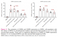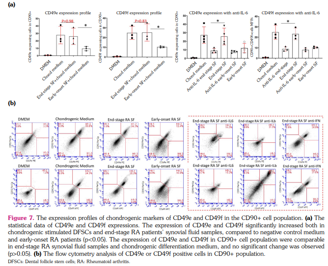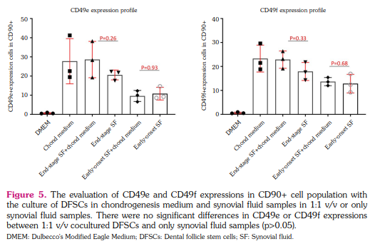 In addition, we analyzed DFSCs cocultures with SF alone or 1/1 (v/v) chondrogenesis differentiation medium/SF to evaluate whether the stimulation with chondrogenesis supplements changed the cell surface marker expression on DFSCs. The mean CD49e and CD49f expression in CD90+ DFSCs cultured with both chondrogenesis differentiation medium and SF samples of end-stage RA patients were 25.8±6.9% and 22.5±4.8% respectively, and only with SF samples were 19.4±2.9 and 18.7±3.1 respectively, indicating no significant difference (p>0.05). Similarly, the mean CD49e and CD49f expression in CD90+ DFSCs cultured with both chondrogenesis differentiation medium and SF samples of early-onset RA patients were 12.6±2.7% and 9.4±3.3%, respectively and only with SF samples were 14.1±2.7% and 12.2±2.4%, indicating no significant difference (p>0.05) (Figure 5).